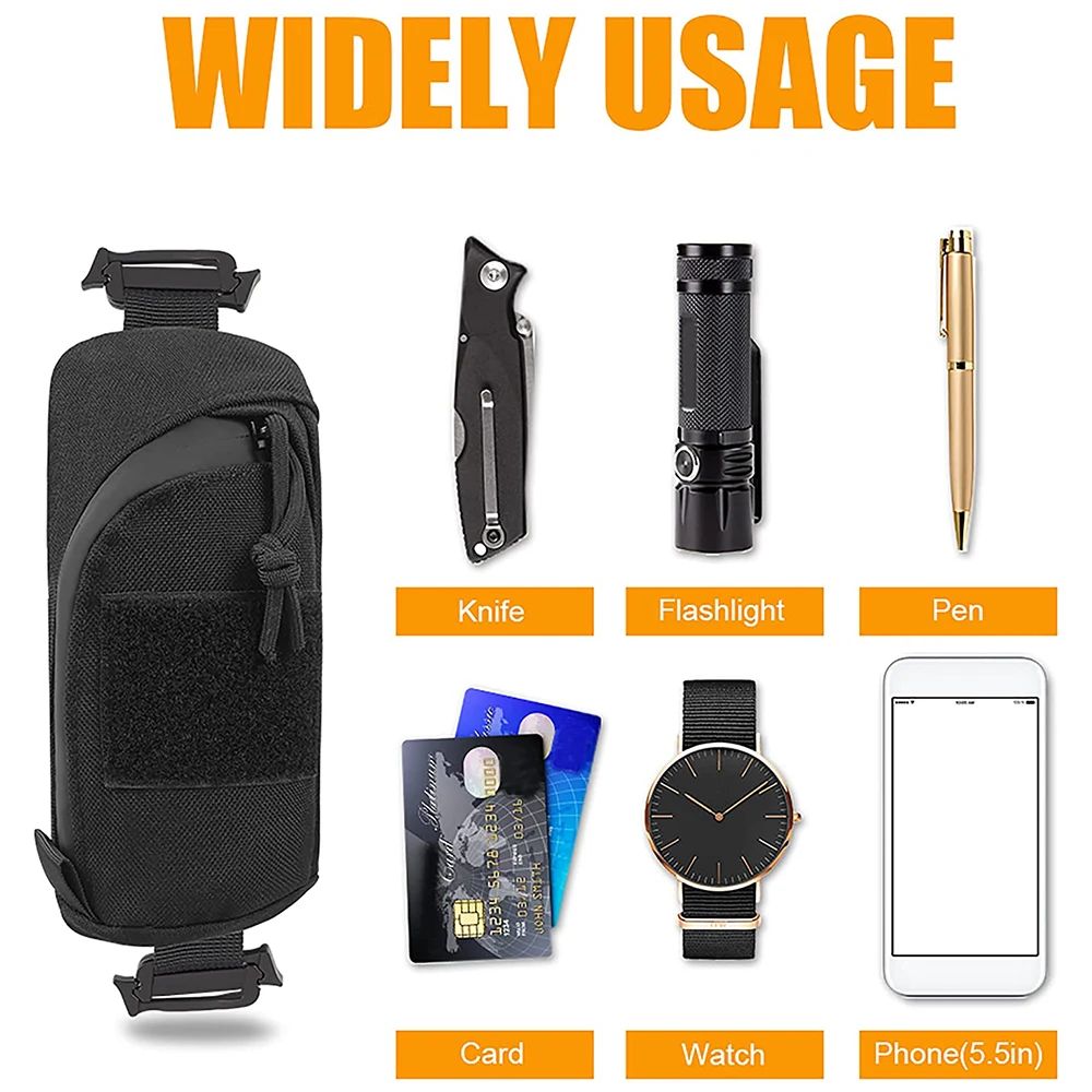 1.Tactical MOLLE Pouch:The shoulder strap pack includes upper and lower Molle straps on the back for a firmer hold on your backpack straps. Two Hook-Loop horizontal straps can also be simply attached to the vertical loops of other types of shoulder straps for a wider range of adaptability.