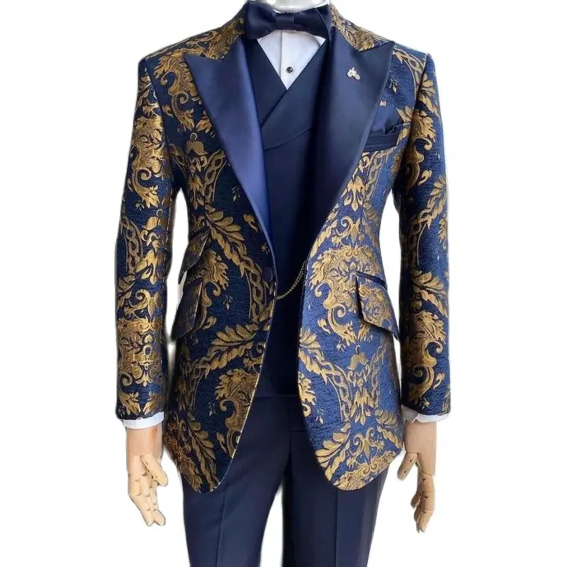 Jacquard Floral Tuxedo Suits for Men Wedding Slim Fit Navy Blue and Gold Gentleman Jacket with Vest Pant 3 Piece Male Costume