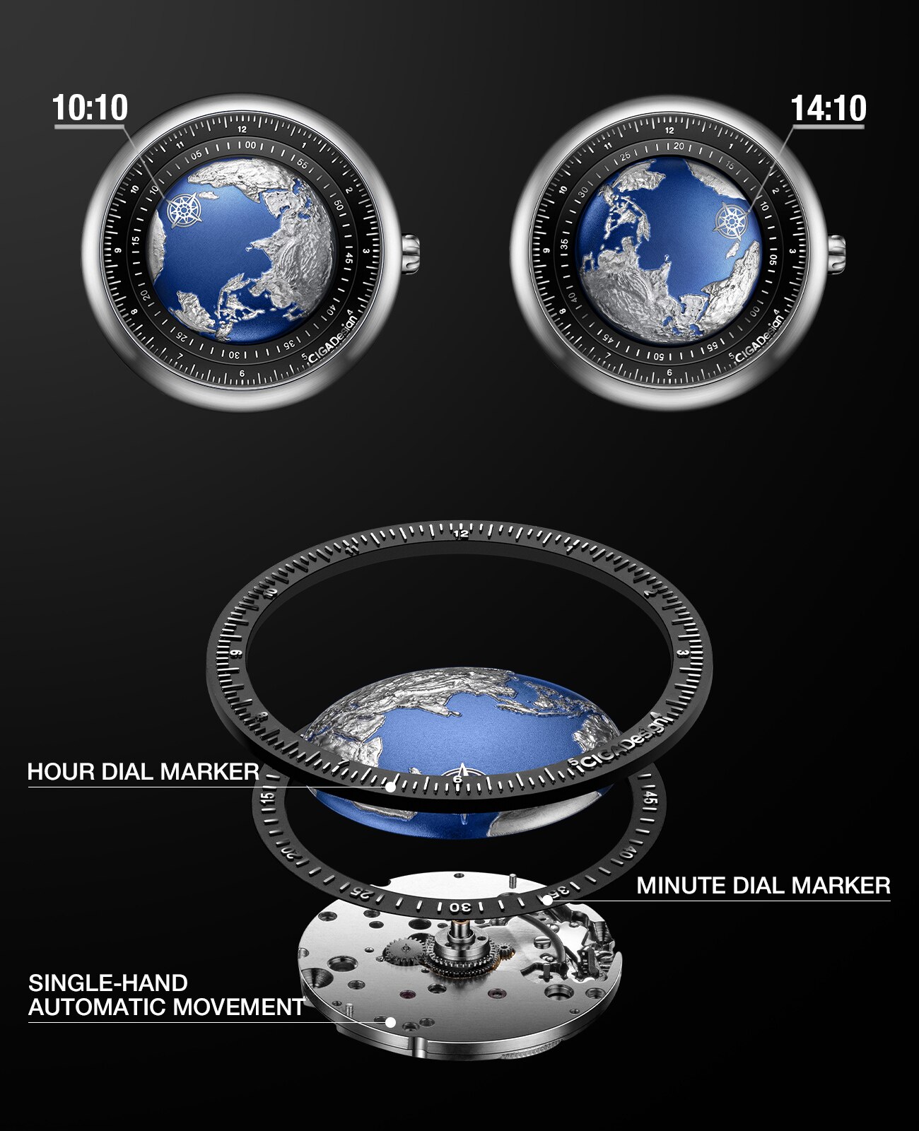 Time originates from the earth revolution and rotation. A circle of the earth rotation represents a day in our lives, just like the earth engravement inside the dial, rotating hour by hour until the day past.
