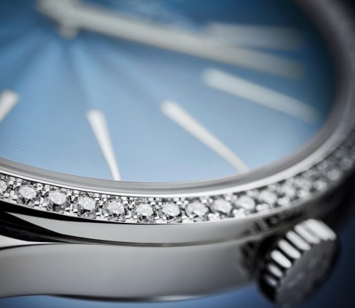 This women's Calatrava timepiece features an engraved lacquered dial with a slightly enlarged case diameter (35 mm diameter) and is equipped with a self-winding movement that replaces the original manual movement. The dial is decorated with a delicate concentric ripple pattern, and the dial base panel is coated with multiple layers of transparent varnish to reveal a delicate and deep midnight blue light. The bezel is decorated with 76 round-cut flawless Wesselton diamonds. The new watch features a satin-brushed calfskin strap with a shimmering navy blue that echoes the colour of the dial.