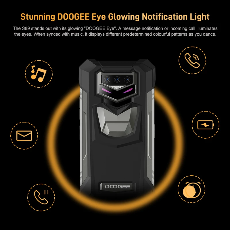 The S89 Pro stands out with its glowing "Doogee Eye". A message notification or incoming call illuminates the eyes.