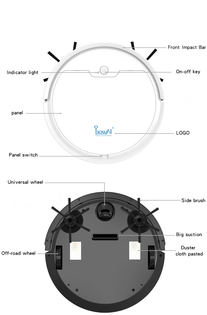indicating that the charging is being charged and the OFF indicates that the charging is complete and the general charging time is about 2-3 hours .Function: One-button start, sweeping, mopping, vacuum cleaner, USB charging, universal driving, automatic avoidance obstacles, anti-drop, low noise, intimate, low repetition, high coverage