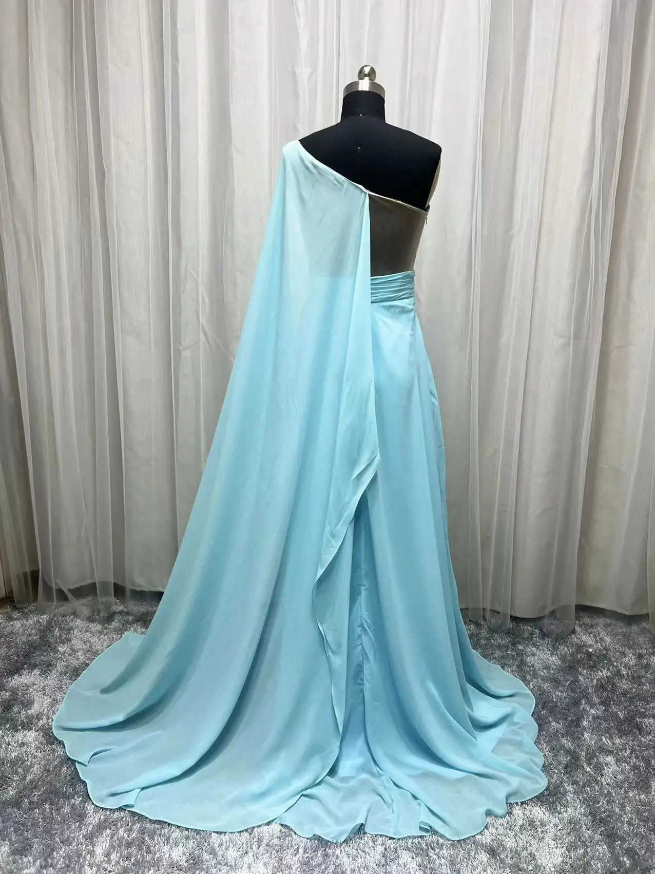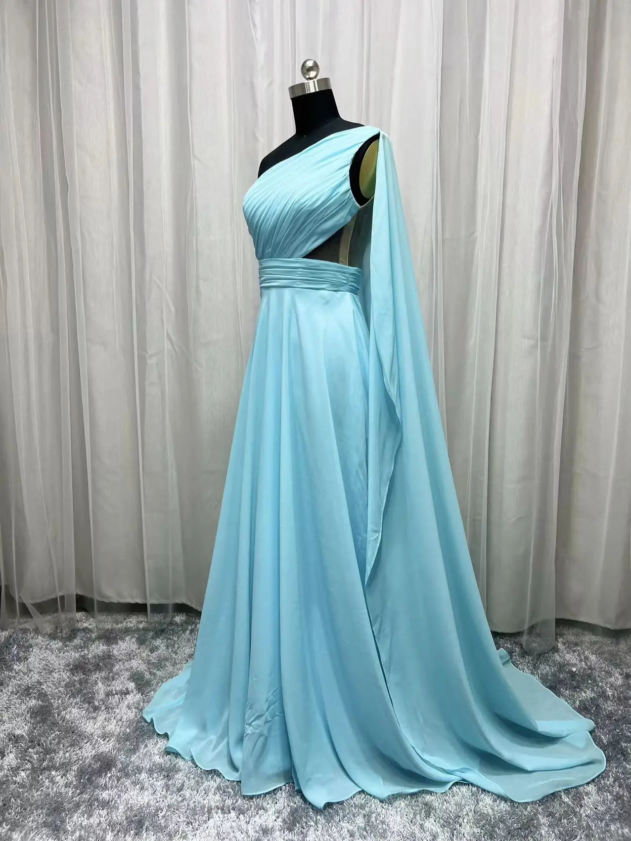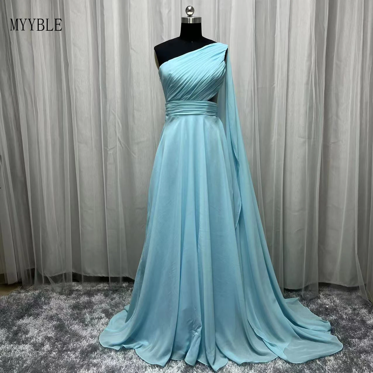 Real Photo Light Blue Mother of Bride Dress One Shoulder Pleated Chiffon Long Saudi Arabic Prom Evening Gowns For Wedding Party