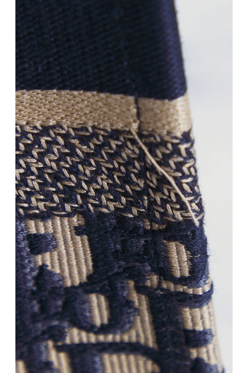 Navy oblique embroidered canvas exterior with embroidered seams and edges