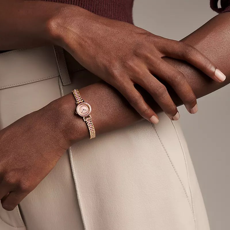 Rose gold watch with precious stones, quartz movement, rose opal dial with precious stones, rose gold bracelet set with precious stones.