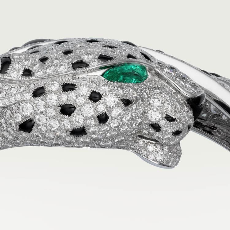 PANTHÈRE DE CARTIER bracelet - 950‰ platinum, set with 2 emerald panther eyes, 146 onyx leopard spots, 1 onyx leopard nose, 1,132 round brilliant-cut diamonds totaling 16.05 carats.